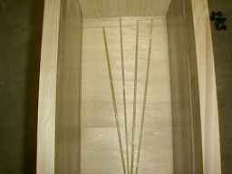 (幅5mmからの竹の加工ですが手作業は大変ですので覚悟して取りかかってください。もし、それが大変なら、ホームセンターなどで『たこあげ製作用竹ひご』など売っていますので、手を抜きたい方は(笑)そちらをどうぞ。)もう一つは、工作などに使われる3mm(くらいですよね?)の均等幅の竹ひごを底板 から3/4の高さの位置に『横』に4、5本を均等に7cmの幅に張ります。(この時本体の 横板に少しその竹ひごの太さ分を埋め込む分掘らなければなりませんが・・・難しい かもしれません。この作成法は自作Cajonで見られる方法です。)