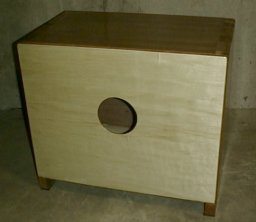 背面も穴は女性が低音を出すための手の位置の打ち場所の真裏の位置に中の体積から考えて、120mm直径の穴を開けました。 |