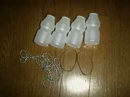 まずは材料です。ヤ○ルトの容器4つと、太めの『輪ゴム』2本、そして『ボールチェーン』100mm1本。